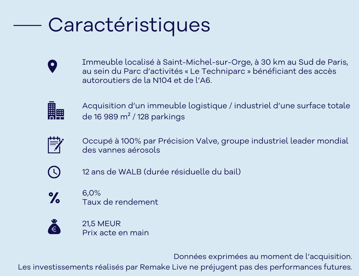 Remake a fait l'acquisition pour le compte de la SCPI Remake Live d'un immeuble de logistique/industriel de 16 989 m² dans le cadre d'un "sales & lease back" situé à St Michel-sur-Orge. Ce site est entièrement loué à Précision Valve, groupe industriel leader mondial des vannes aérosols, dans le cadre d'un bail ferme d'une durée restante de 12 ans.