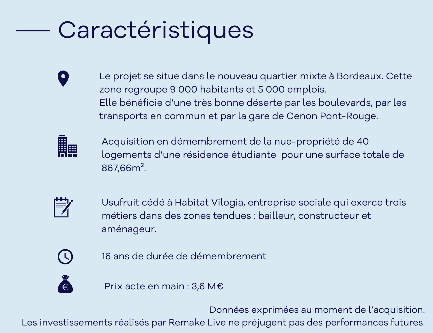 Remake Live, a acquis la nue-propriété de 40 logements étudiants (868 m²) situés au 108 quai de Brazza à Bordeaux.