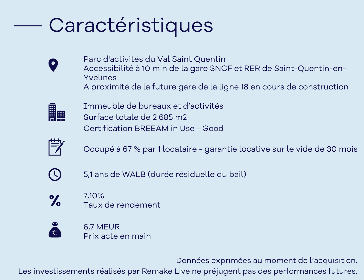 L'immeuble de bureaux est situé au 2 rue René Caudron à Voisins-Le-Bretonneux, proche de Saint-Quentin en Yvelines dans un parc tertiaire arboré faisant partie du projet Paris-Saclay. Développant 2 685 m² au cœur d'un tissu économique important, il est actuellement loué à 67% à une entreprise de génie électrique et d'automation, les 33% vacants faisant l'objet d'une garantie locative de 2,5 ans au total. L'immeuble est situé à proximité de la future gare « Saint Quentin Est » de la ligne 18 du métro.