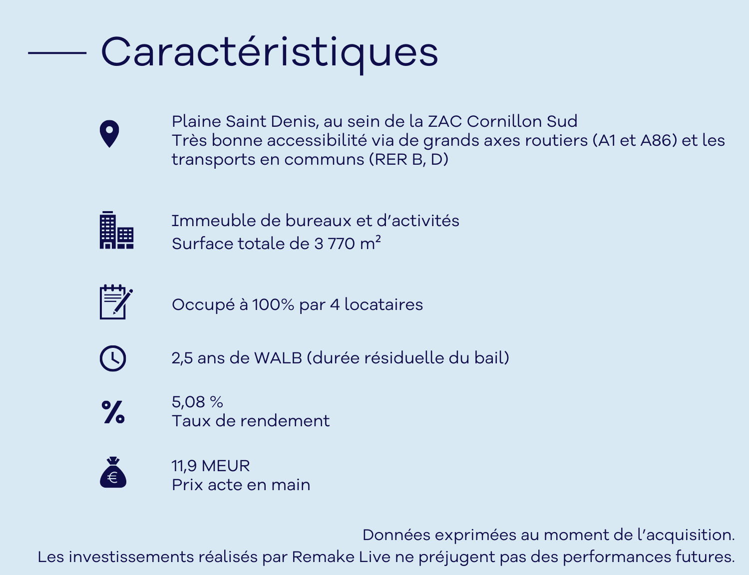 Données exprimées au moment de l'acquisition. Les investissements réalisés par Remake ne préjugent pas des performances futures.