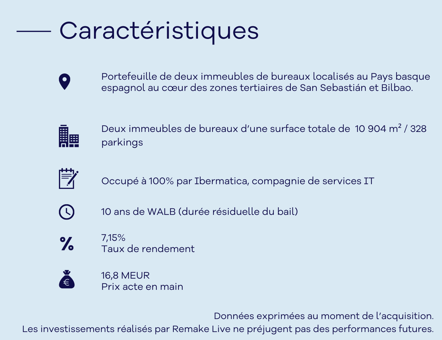 Données exprimées au moment de l’acquisition. Les investissements réalisés par Remake Live ne préjugent pas des performances futures.
