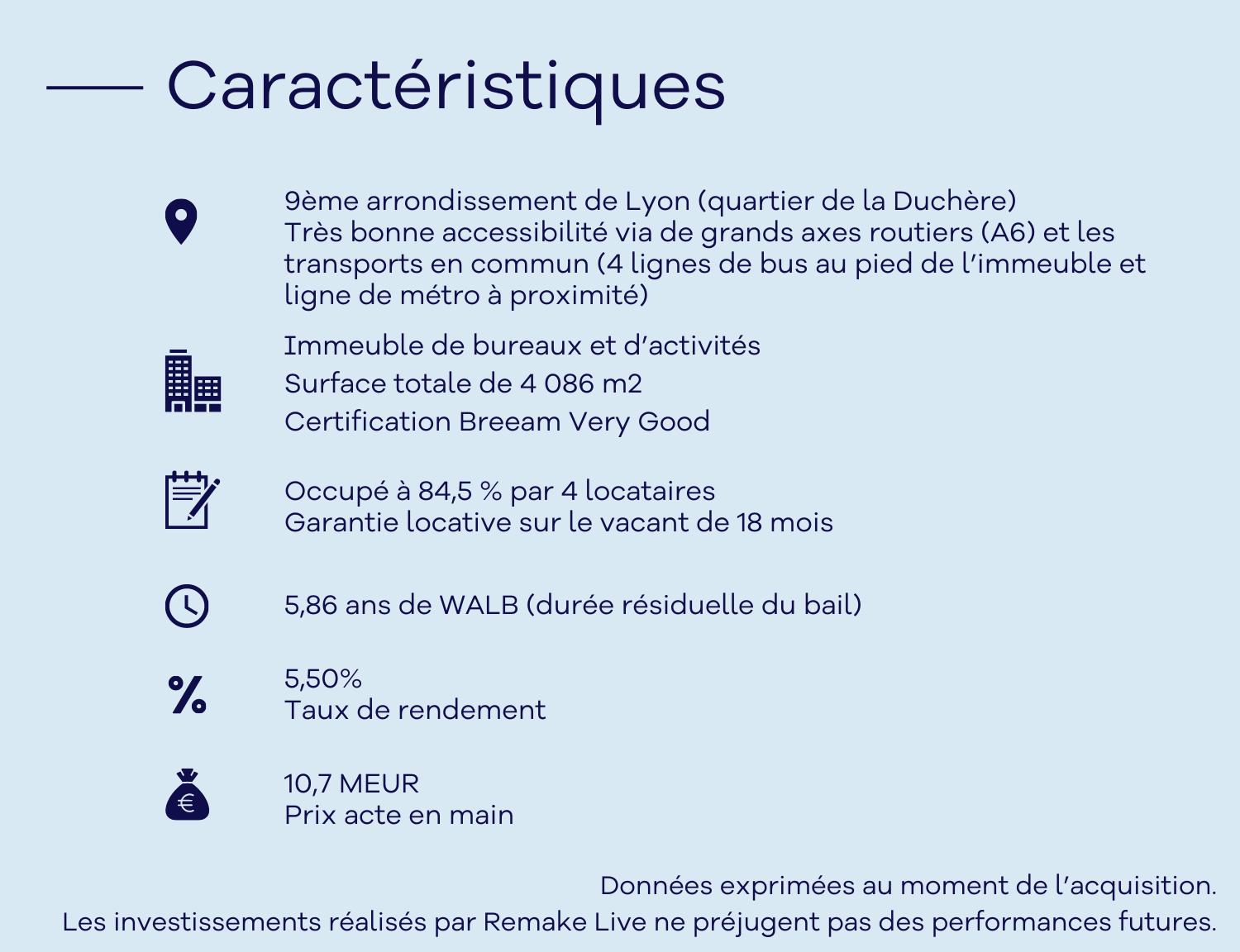 Données exprimées au moment de l’acquisition. Les investissements réalisés par Remake Live ne préjugent pas des performances futures.